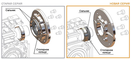 - Функція осьового утримання підшипника і масляний сальник перенесені з фланця на корпус редуктора, що збільшило механічну надійність підшипникового вузла (мал. 2).